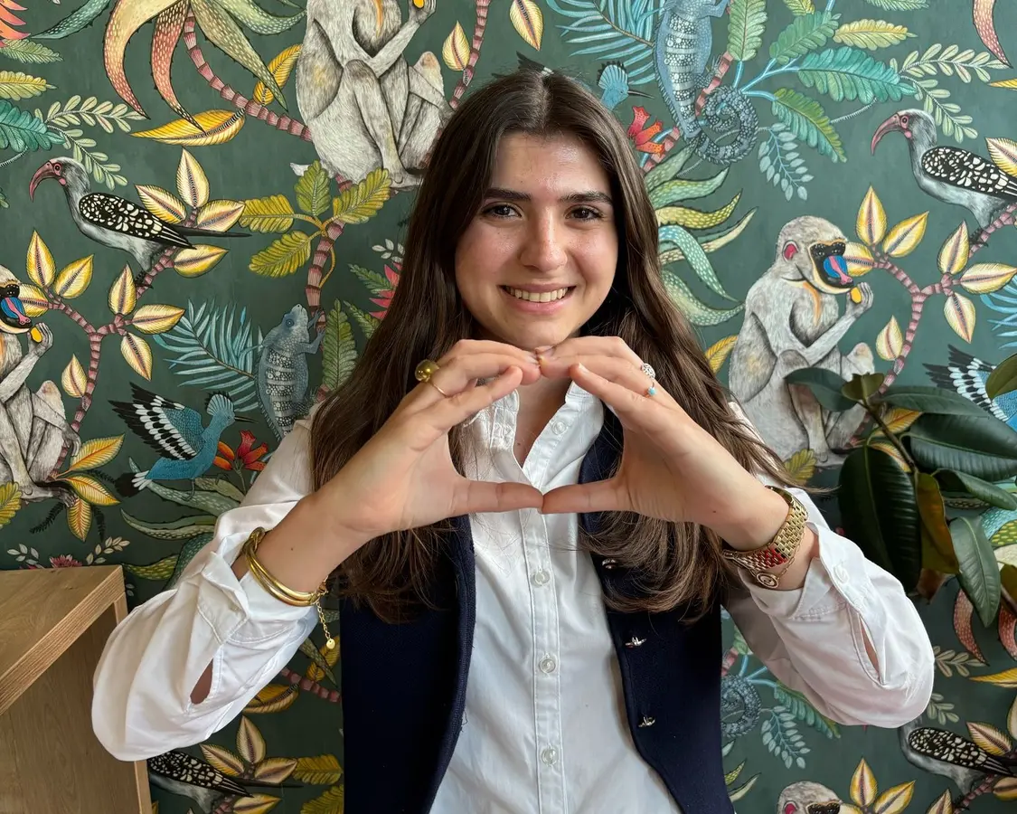 Femme souriant, formant un cadre avec ses mains devant son visage dans un cadre moderne.