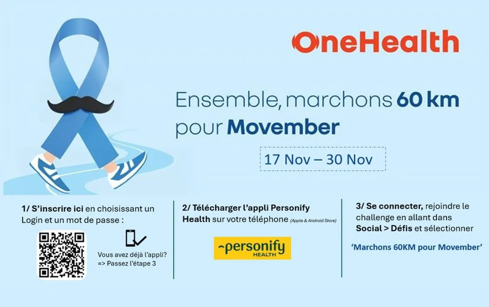 Dans le cadre de notre programme OneHealth, nous lançons le défi « Marchons 60KM pour Movember » afin de promouvoir le bien-être physique et mental.